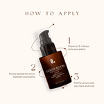 • 3-4 drops of Serum onto your palm. Evenly spread the serum between your palms with gentle motions.