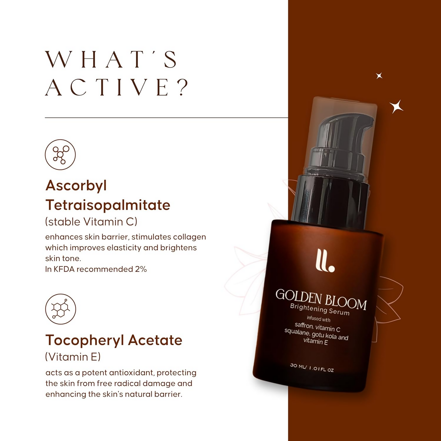 • The Golden Bloom Serum is formulated with SQUALANE, a powerful hydrating ingredient known for its ability to penetrate deep into the skin. This ensures that your skin remains well-moisturised throughout the day, maintaining a soft, supple texture.