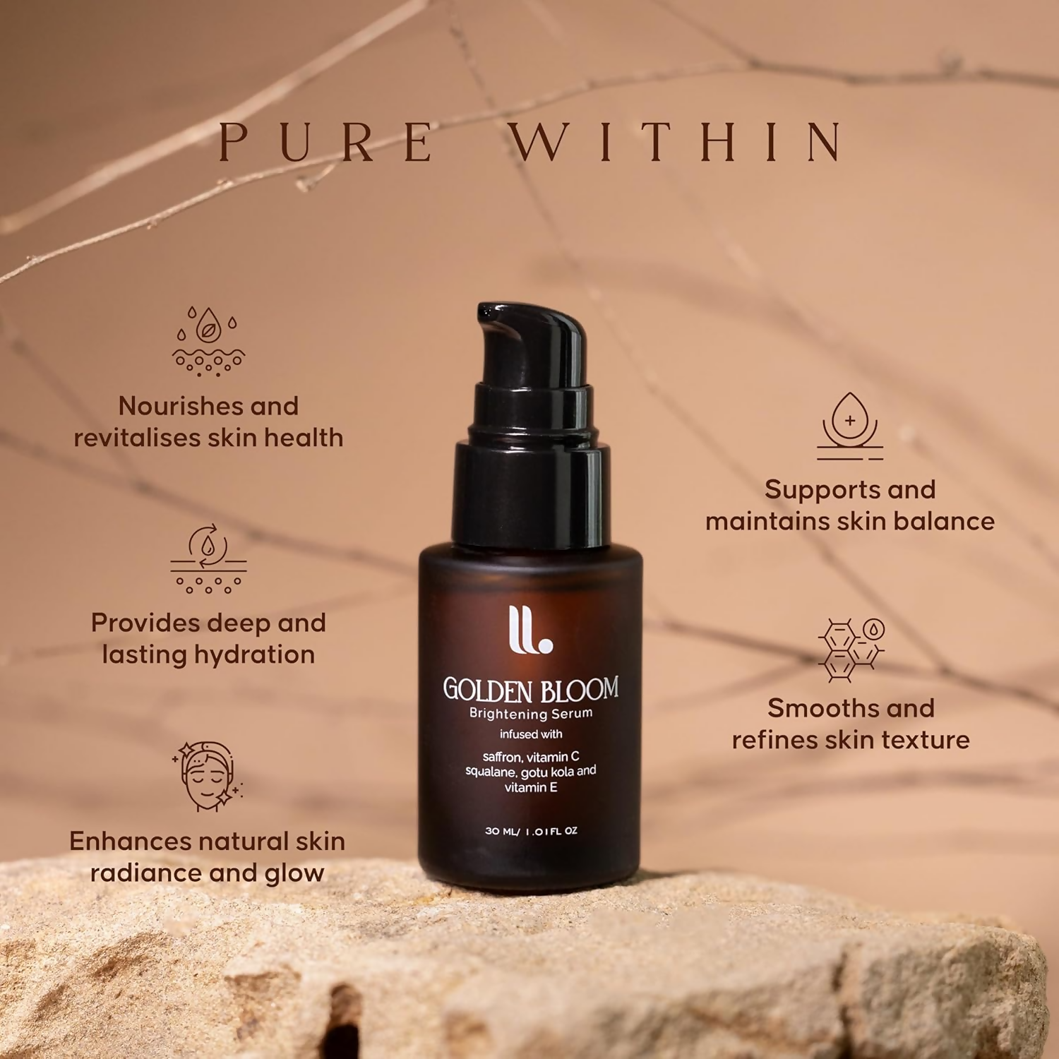 •  Infused with a blend of botanical wonders, including KUMKUMADI oil, the Golden Bloom Serum delivers essential nutrients that nourish and revitalize the skin. These natural ingredients work together to improve the overall health of your skin. Regular use of this serum can help restore your skin's vitality, leaving it looking refreshed and rejuvenated.