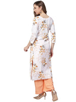Ahalyaa White & Peach Floral Jacket Style Kurta With PlazzoThis Ahalyaa faux crepe combo includes a floral printed kurta with a shimmer print p...