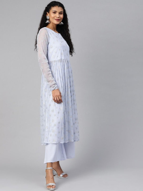 Ahalyaa Women's Blue Net Silver Glitter Printed Kurta Palazzo Set"This clothing set consists of Kurta Palazzo Set. Blue Net Silver Glitter Print fl...