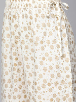 Off-white and golden printed palazzos, has elasticated waistband with drawstring closure