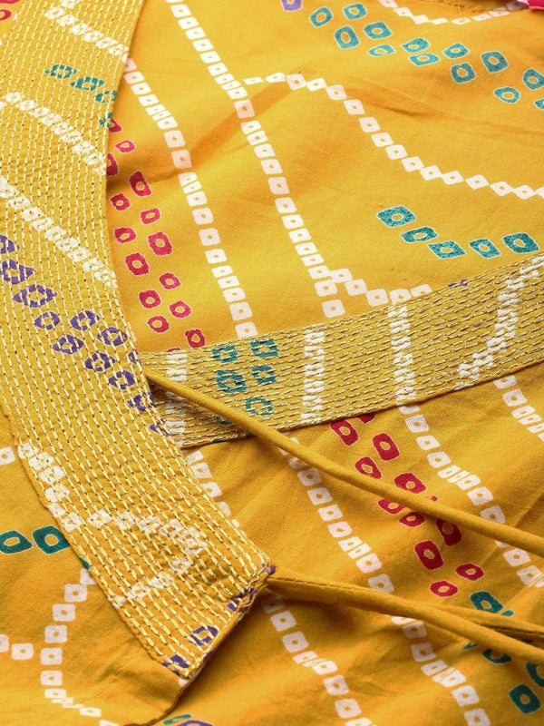 Mustard yellow Bandhani print Anarkali calf length kurta, has a V-neck, three-quarter sleeves, flared hem