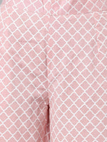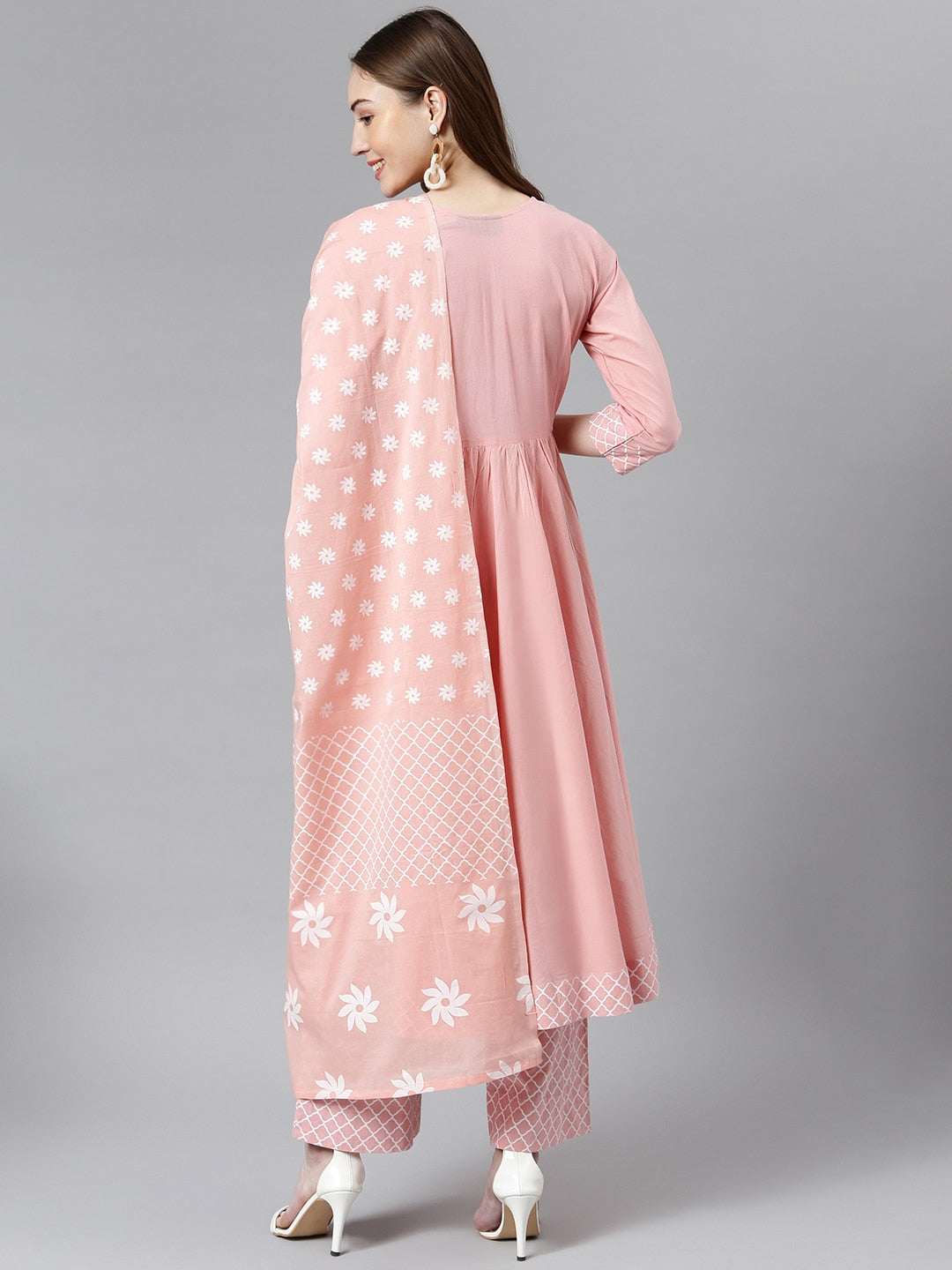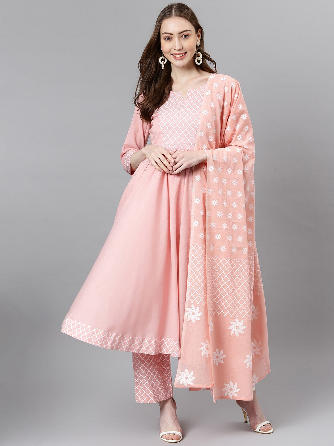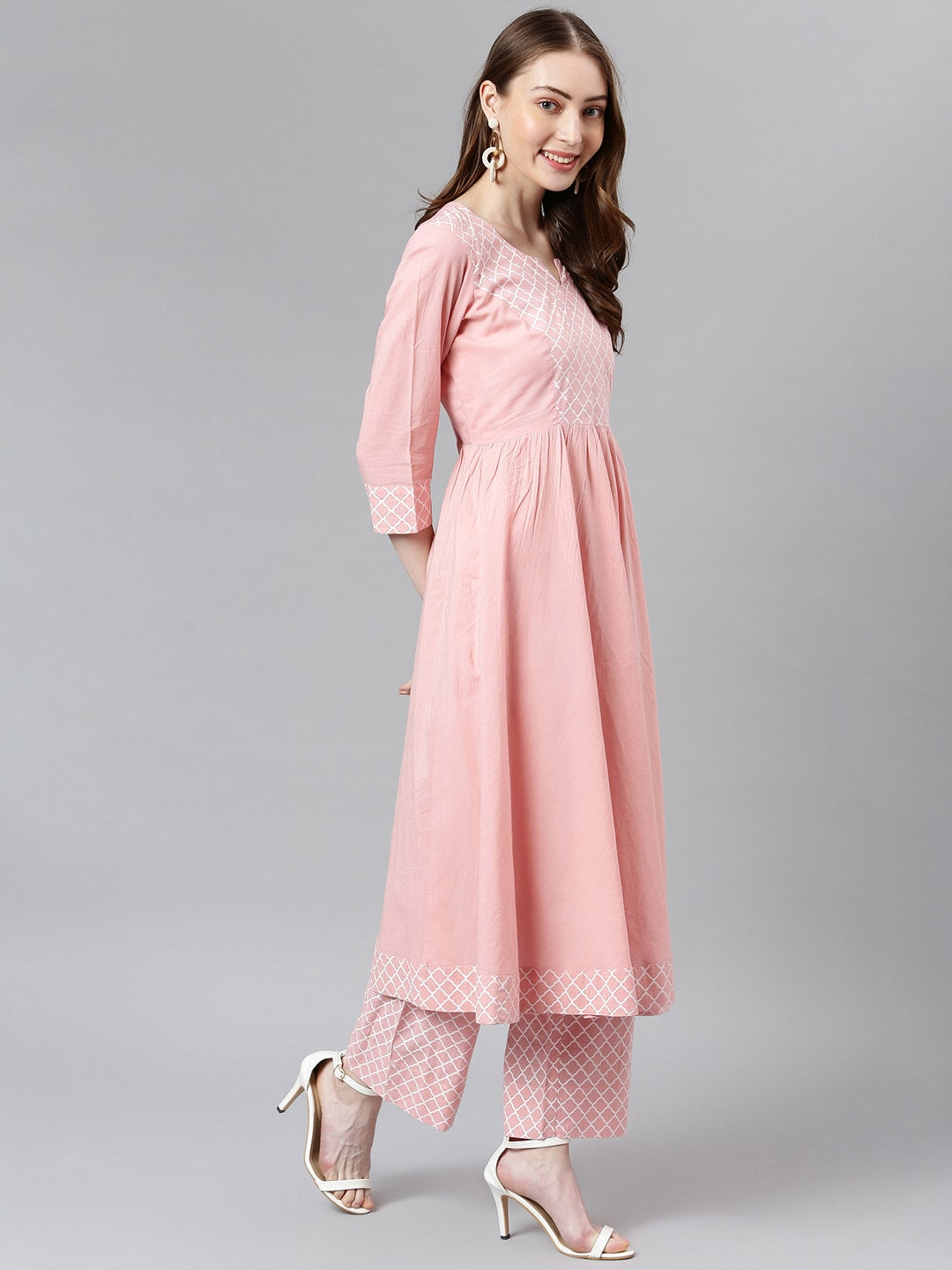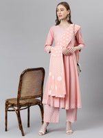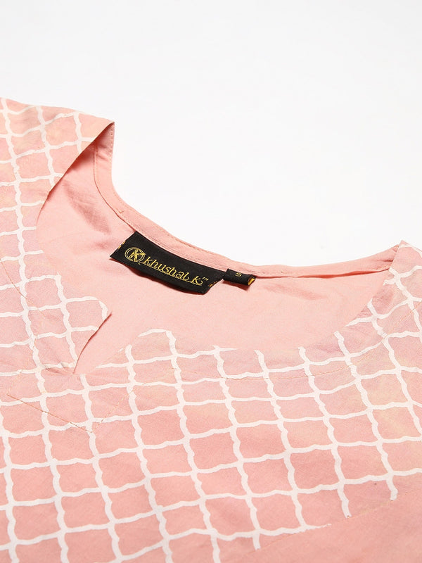 Peach-Coloured A-line calf length kurta, has a round neck, three-quarter sleeves, flared hem