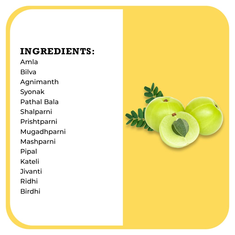 Key Ingredients: Amla, Bilva, Agnimanth, Syonak, Pathal Bala, Shalparni, Prishtparni, Mugadhparni, Mashparni, Pipal, Kateli, Jivanti, Ridhi, Birdhi