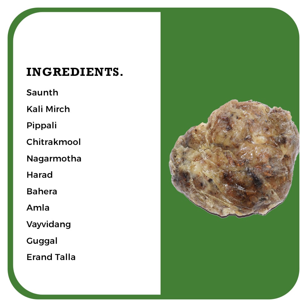 Key Ingredients:Saunth, Kali Mirch, Pippali, Chitrakmool, Nagarmotha, Harad, Bahera, Amla, Vayvidang, Guggal, Erand Talla