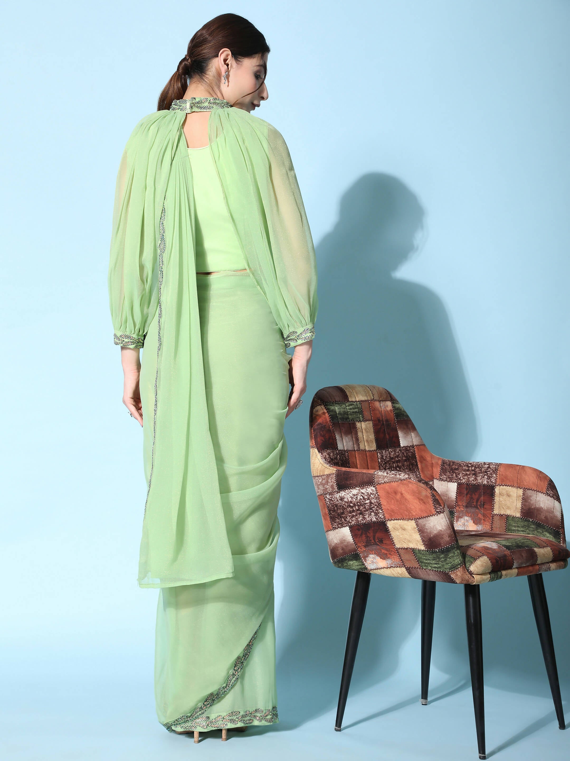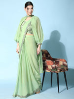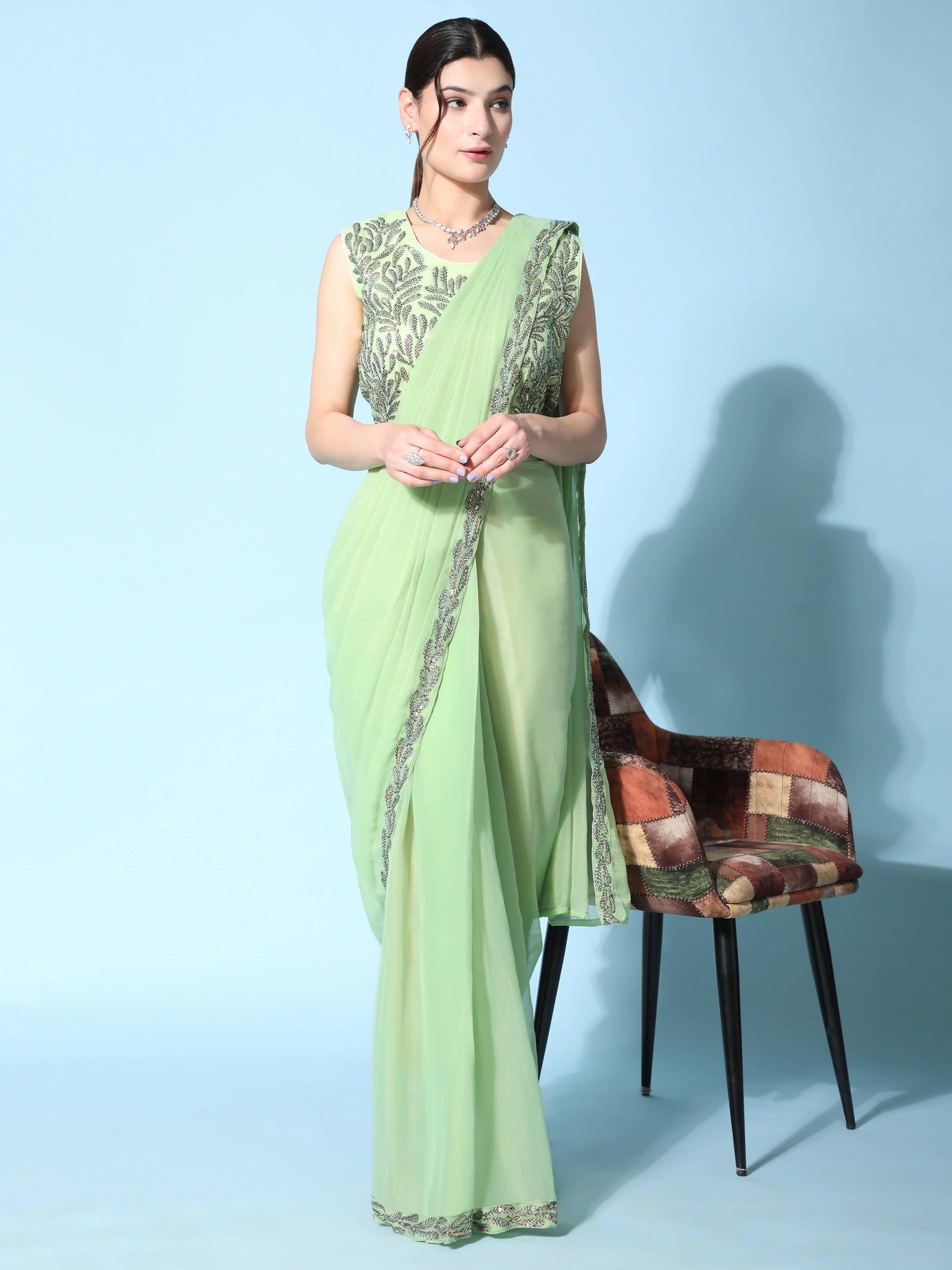 Green Fancy Pure Fabric Plain Ready to wear Saree with stitched Blouse - Vrinda