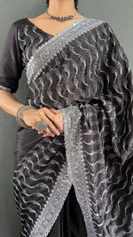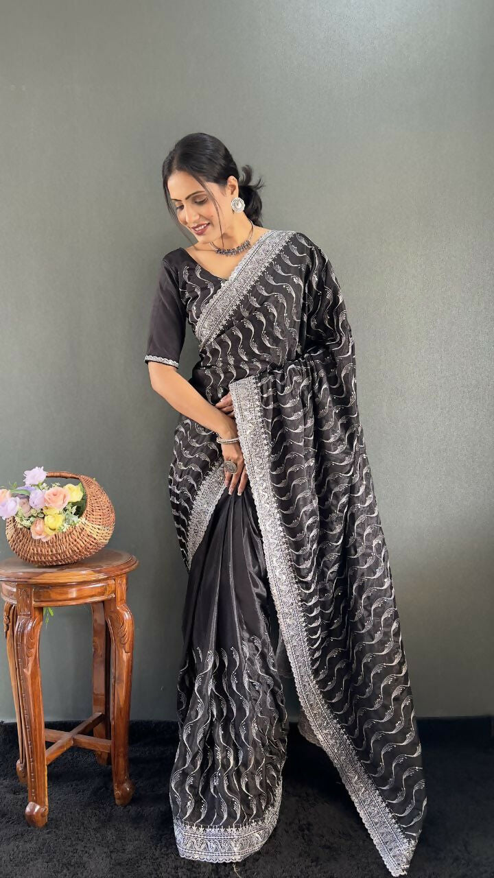Vastranavya Black Chinnon Silk Embroidery Multi Sequence & Arco Cut Work Ready to Wear Saree - Up to 44 Waist