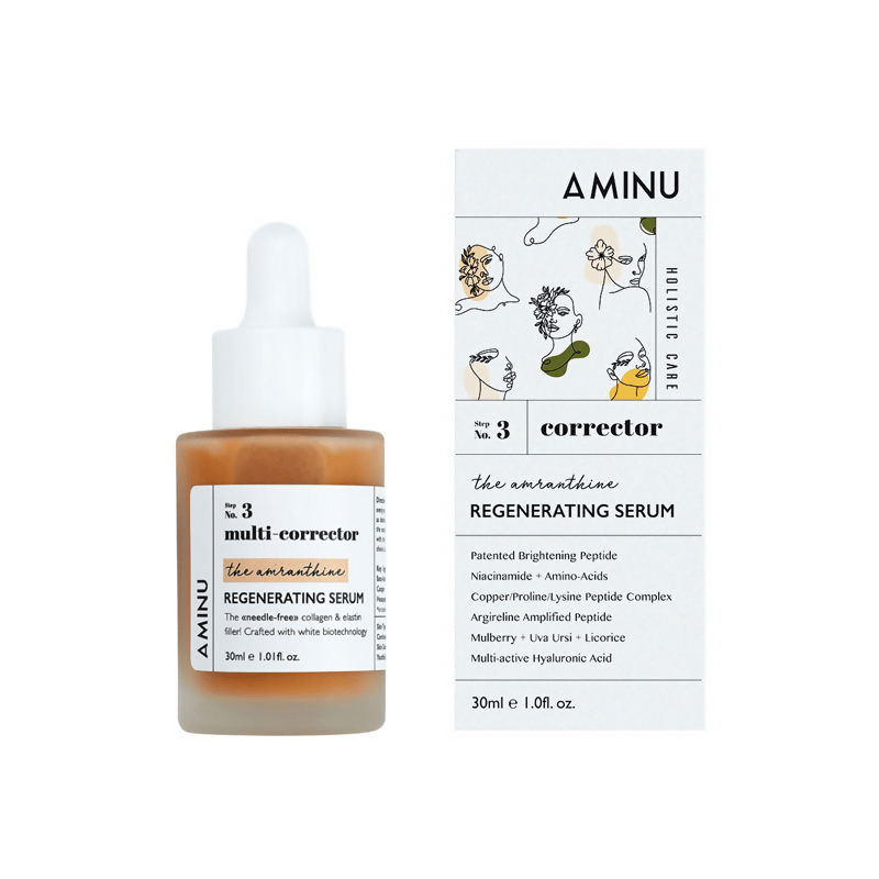 Aminu Regenerating Serum is the ultimate treatment for better ageing! This multi-peptide serum is a pure source of bio-energy that diffuses naturally into the skin. It is crafted with white biotechnology to enhance the skin's essential multi-dimensional defence against visible signs of ageing, environmental factors, and daily stress. This peptide serum mitigates the appearance of fine lines, wrinkles, age spots, dullness and the loss of firmness. It can be used as a part of the core everyday regime as a day or night serum for an extra boost to your skin health and to protect against premature ageing.