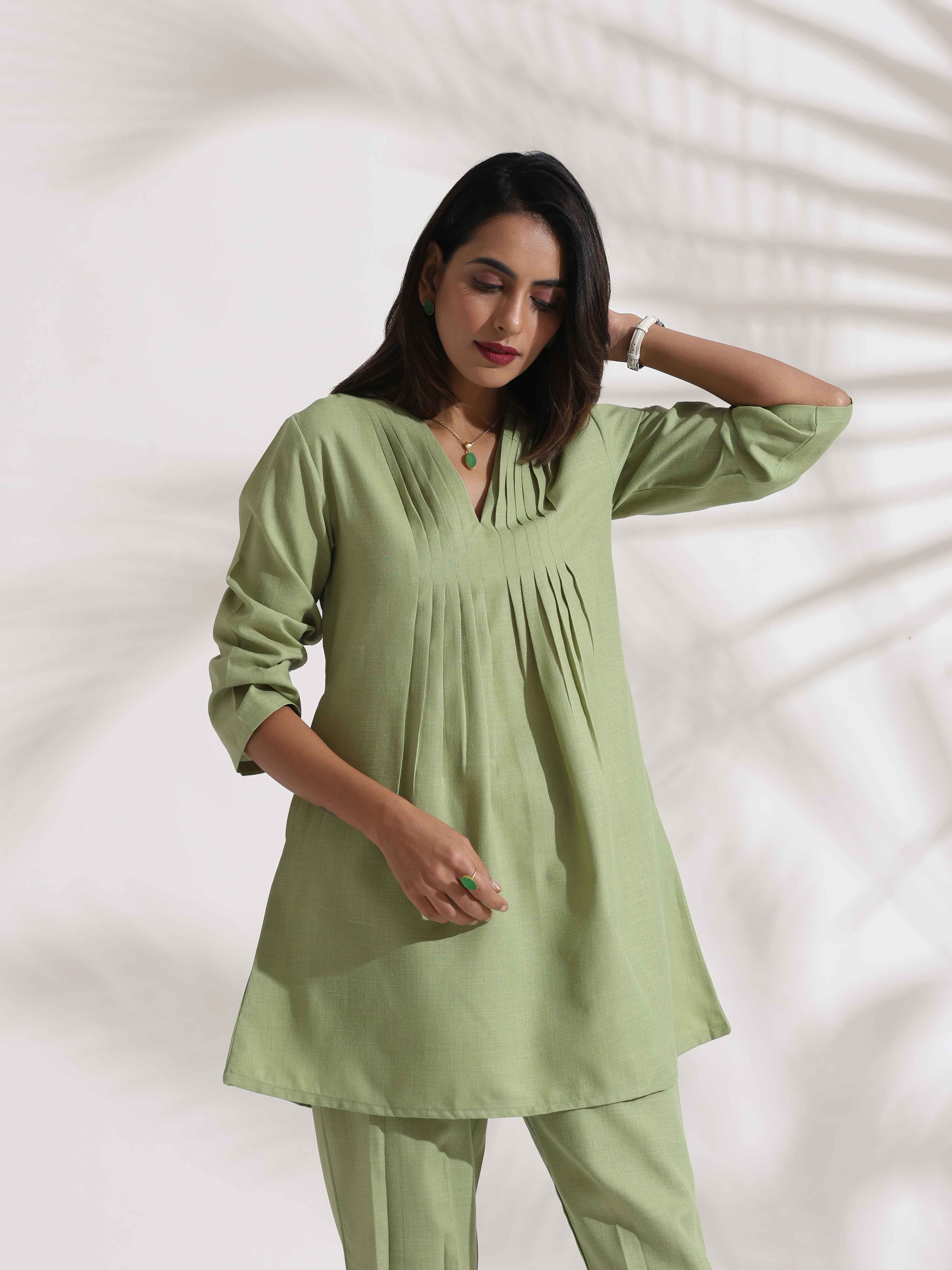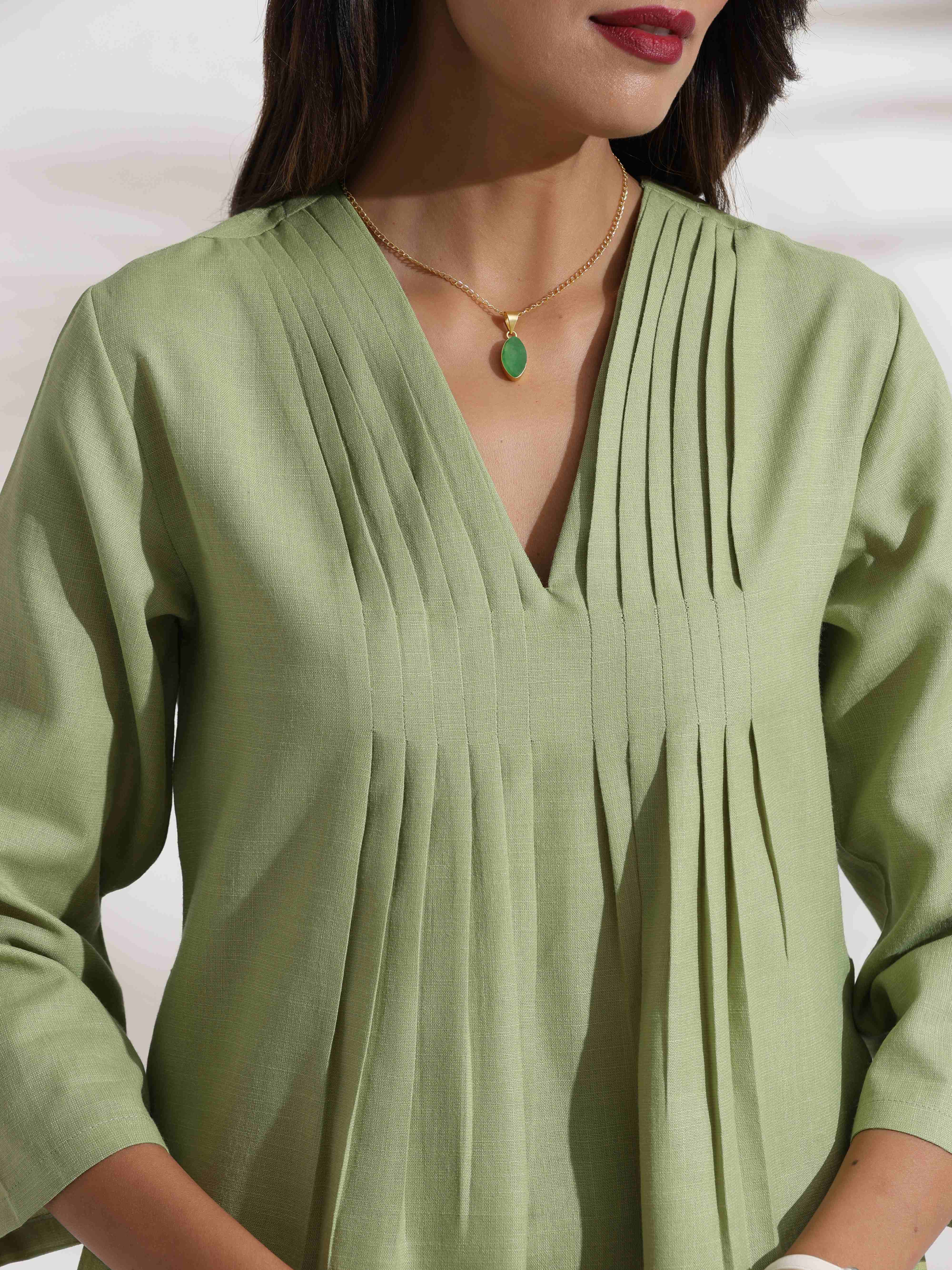 • Elevate your style with this green V- neck pleated top with green pants, it's an ideal blend of elegance and comfort.
