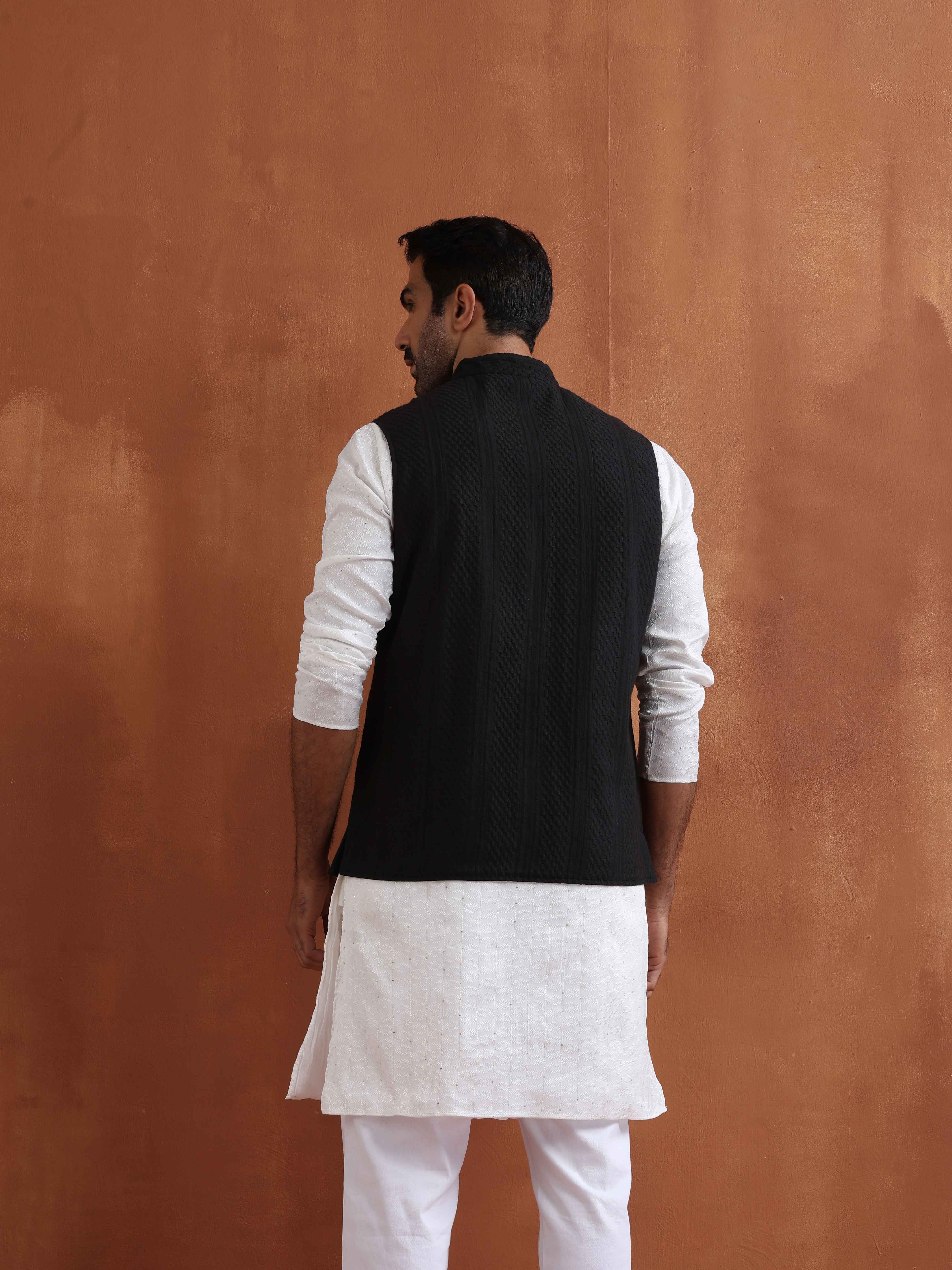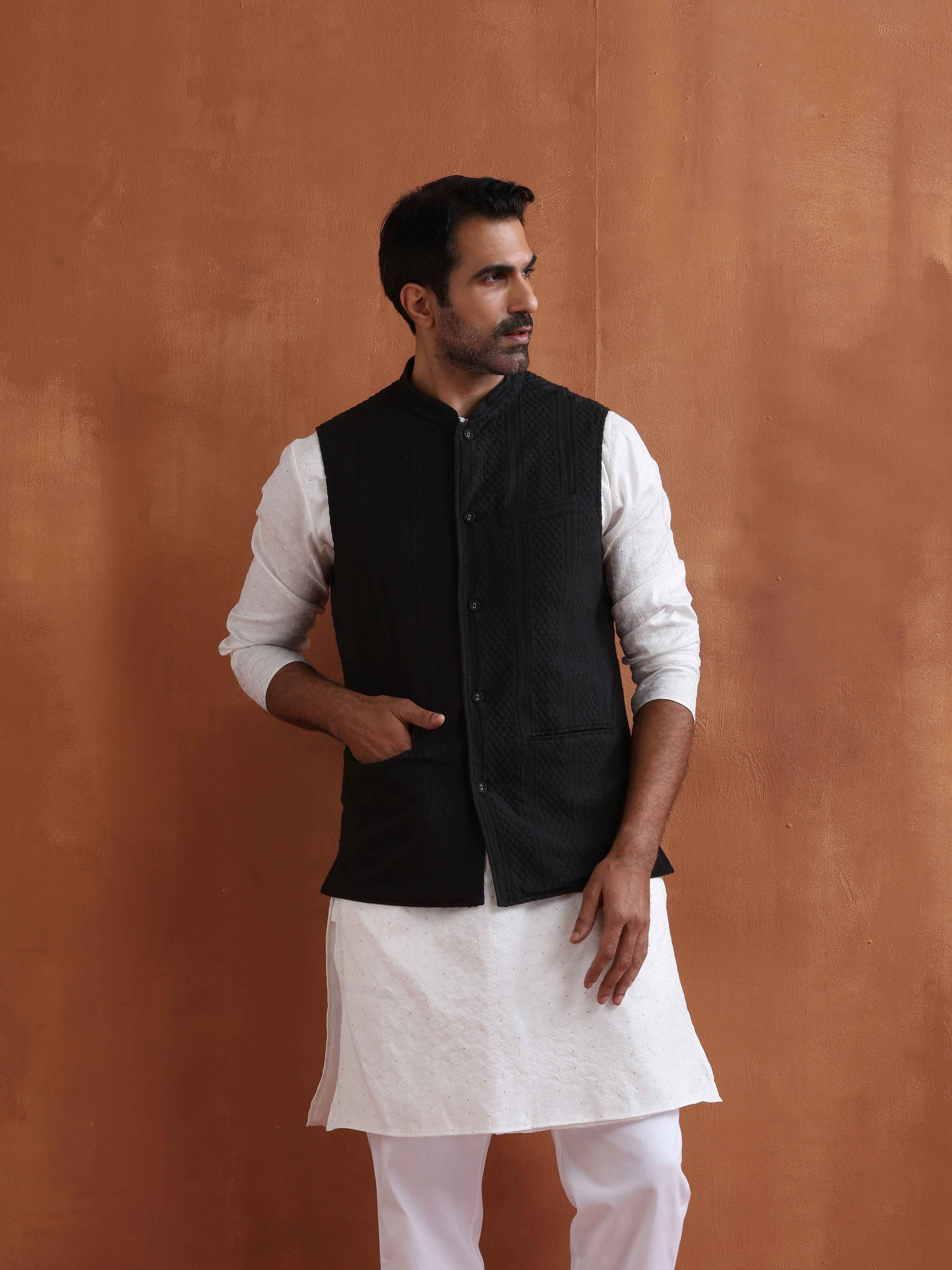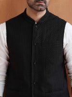 • Upgrade your festive wardrobe with this black textured cotton dobby nehru jacket.
