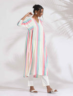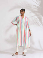 trueBrowns Off-White Cotton Multi Stripe Flared Kurta SetDescription Elevate your style with this stripe cotton flared kurta along with paneling an...