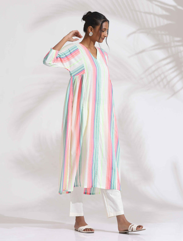 • Elevate your style with this stripe cotton flared kurta along with paneling and light gathers at sides for added flare, paired perfectly with solid cotton pants.