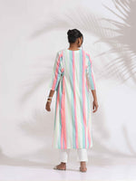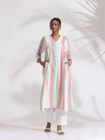 trueBrowns Off-White Cotton Multi Stripe Flared Kurta Set - XS