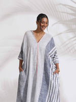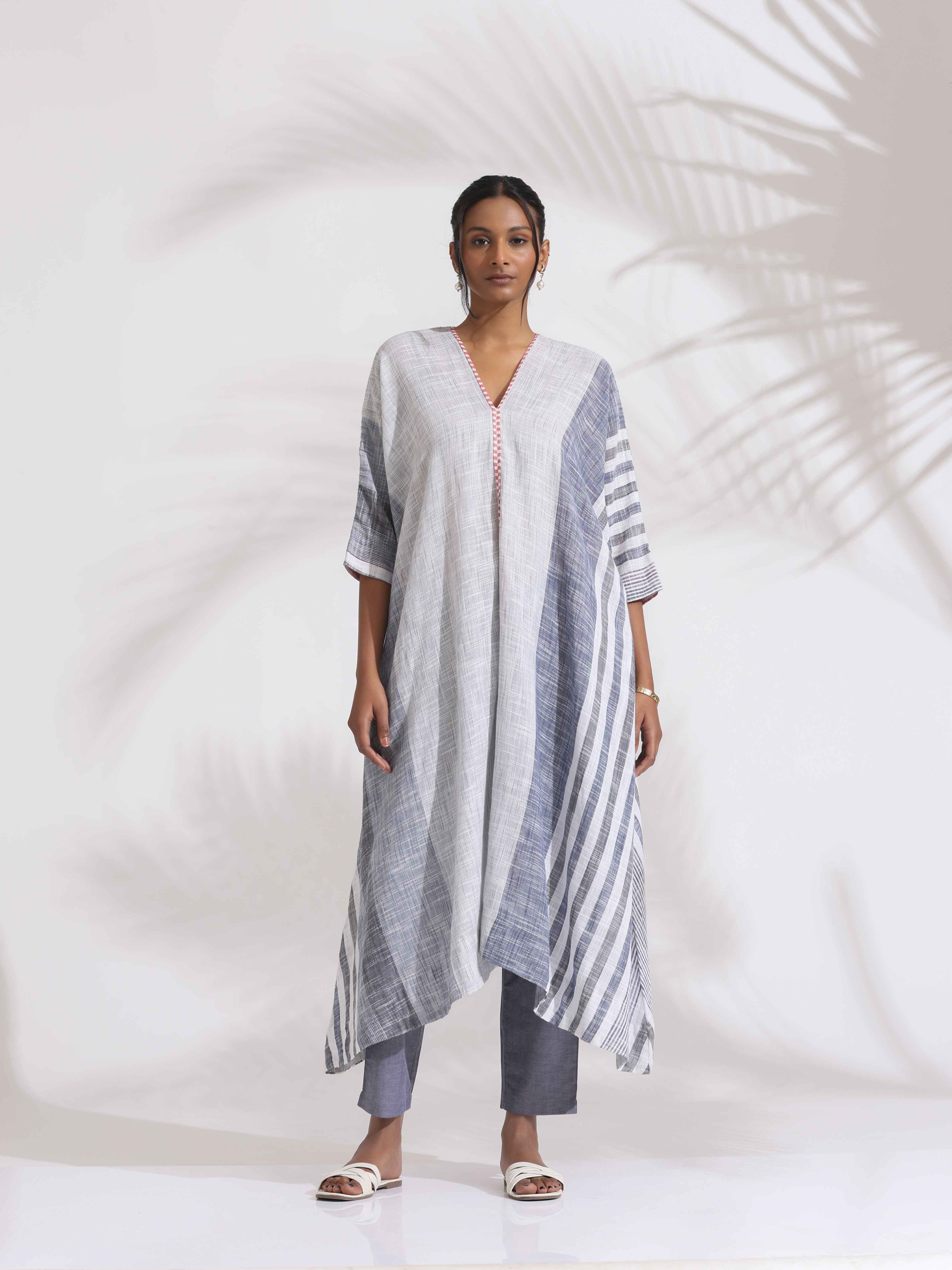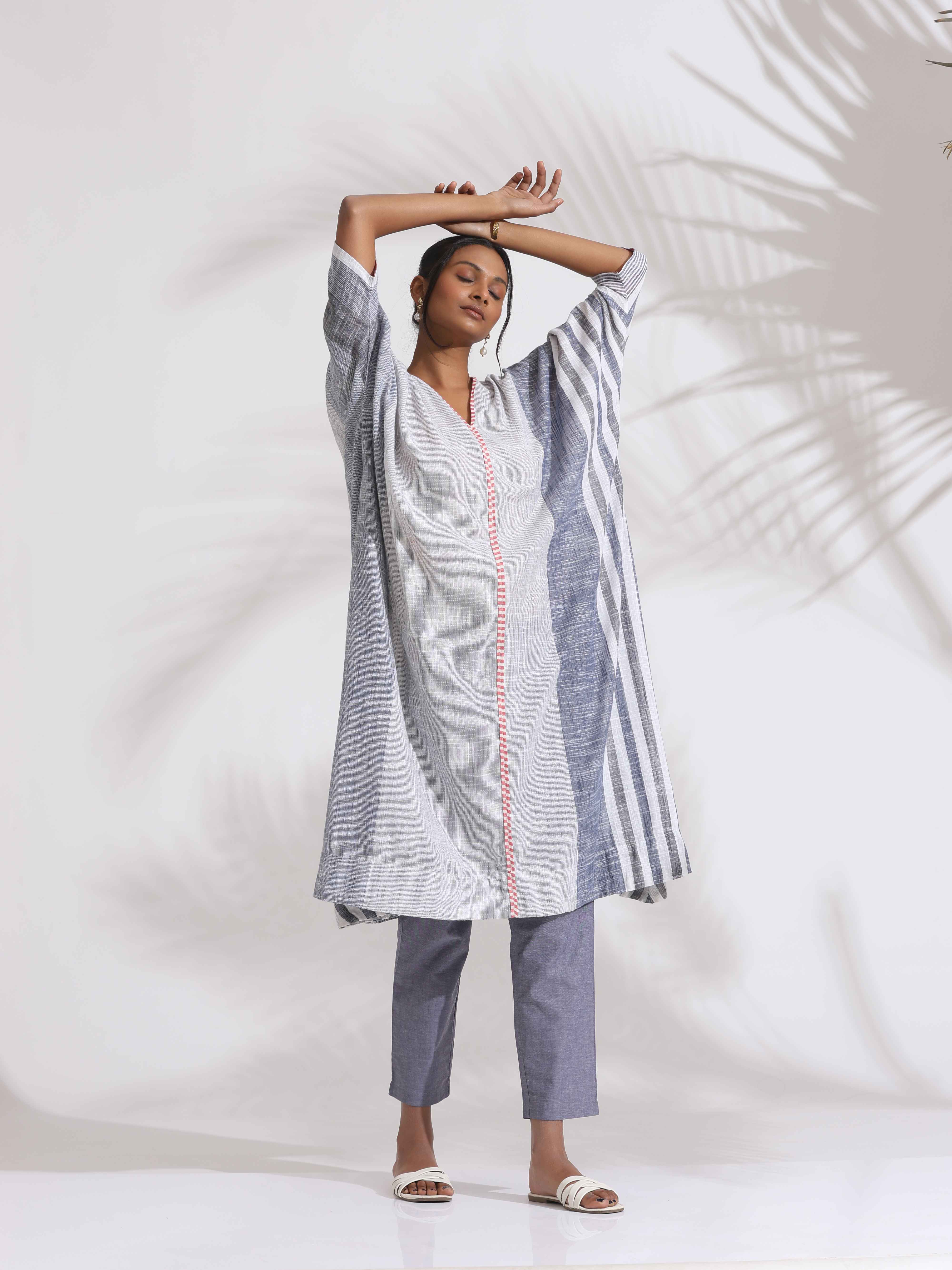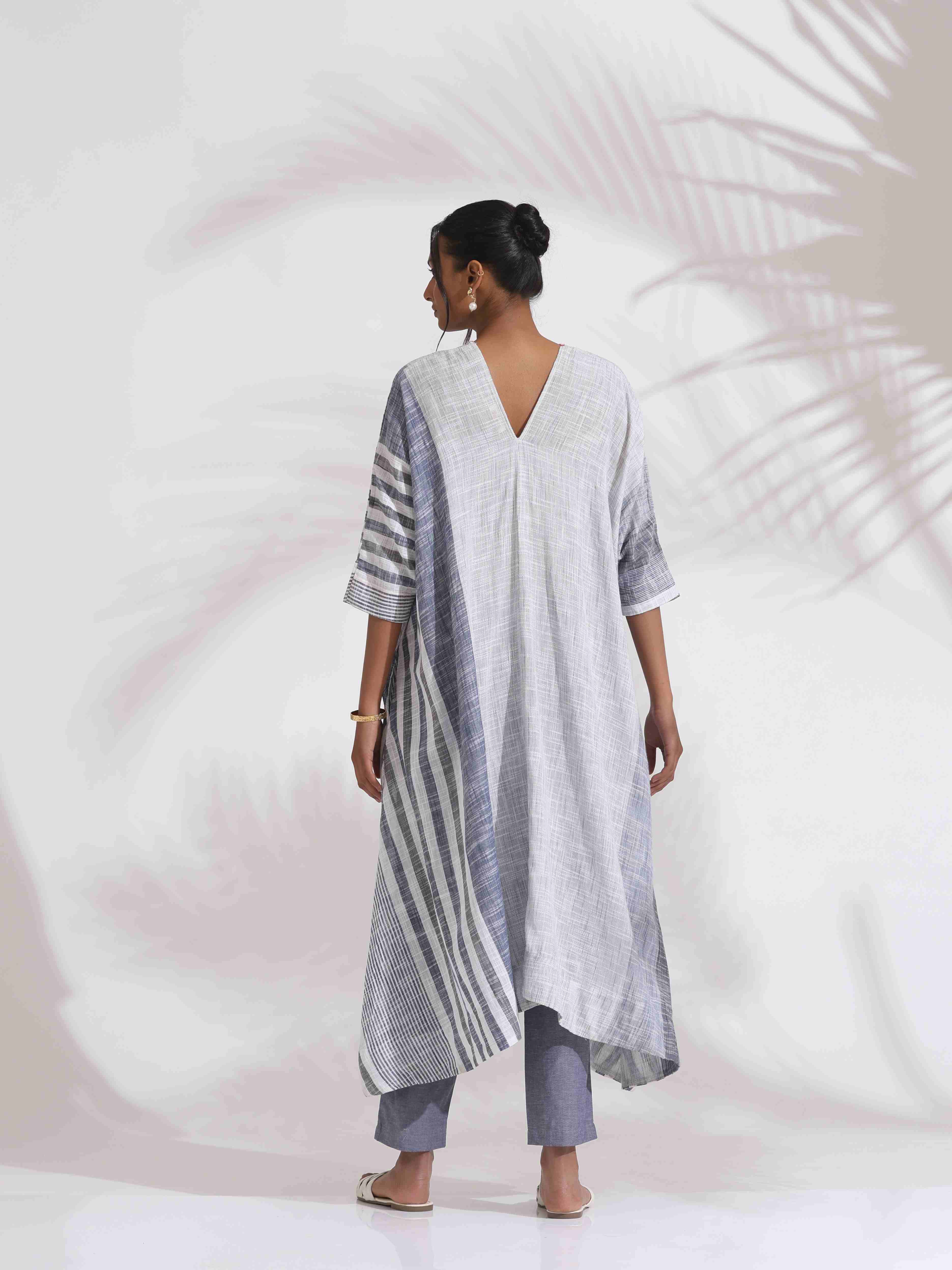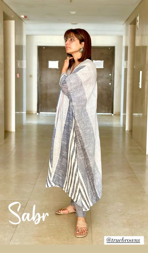 • Elevate your style with this off-white multi stripe free size flared kurta with grey pants, it's an ideal blend of elegance and comfort.