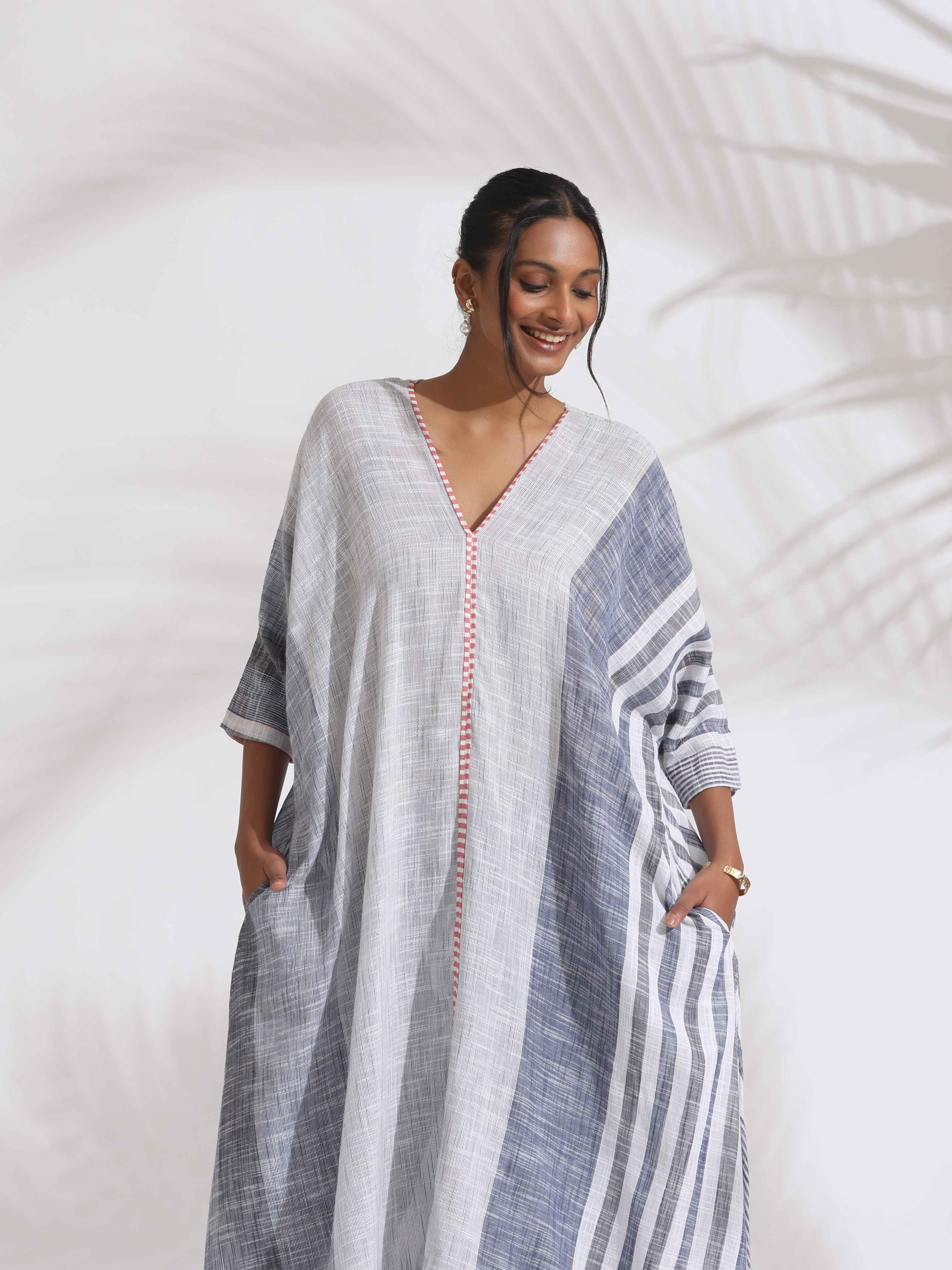 trueBrowns Off-White Cotton Multi Stripe Flared Kurta Set
