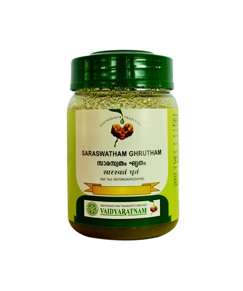 Vaidyaratnam Saraswatham Ghrutham is enriched with herbal goodness. Each 10gm of the herbal ghee is made with