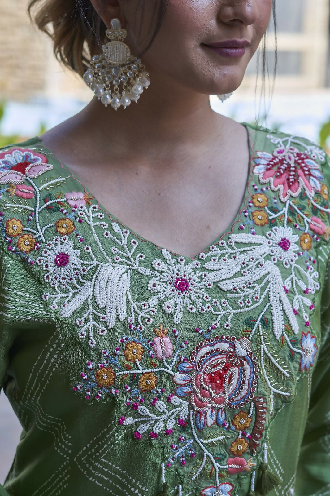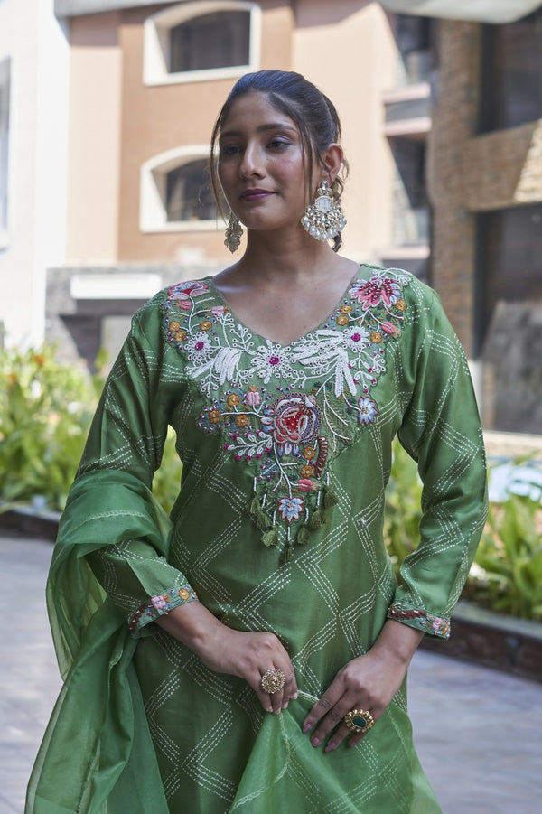 Joban Fashion Green Cotton Premium Pure Viscose Print Dola With Handwork Kurta set Color : Green No of Pieces : 3 Top Length : 46-48 Lining : C...