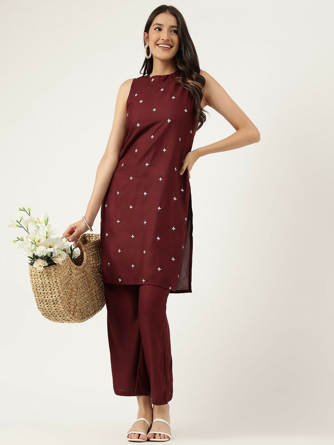 Joban Fashion Mahroon Rayon and Embroidered Work Straight Kurta Bottom Set Color : Maroon Fabric-Top : Rayon Fabric Bottom : Rayon Components :...