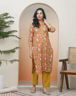 Mustard Floral printed collared neckline straight kurti with mustard pant