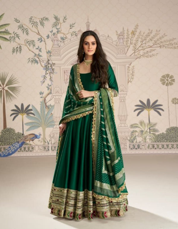 Aarshi Fashions Green Silk Wedding Gowns About the Product: Length of Kurta: 54 Kurta Style: Gowns Kurta Fabric: Silk Kurta Colour: Green Bott...
