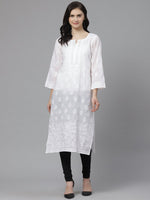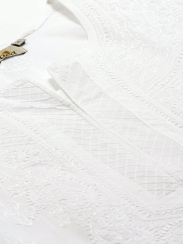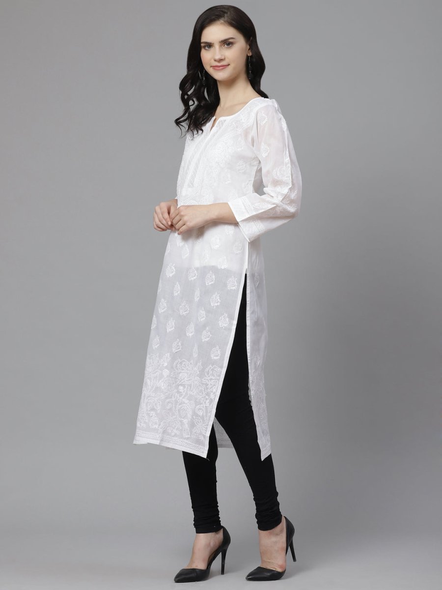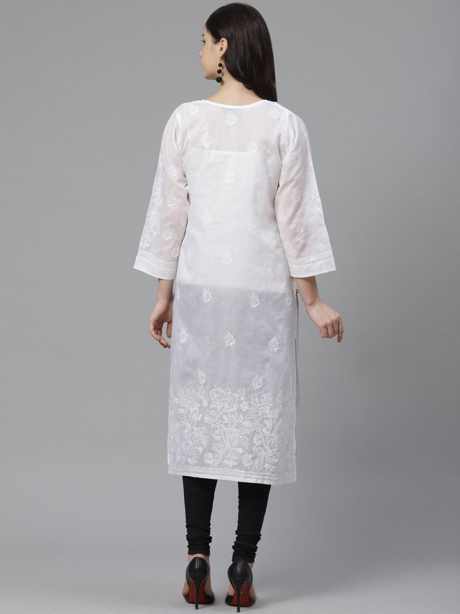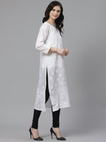 White straight calf length semi-sheer kurta, has a round neck, three-quarter sleeves, straight hem, side slits
