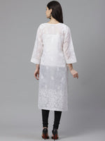 ADA Women White & Black Chikankari Embroidered Semi-Sheer Sustainable Handloom Kurta with Churidar
