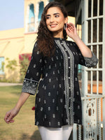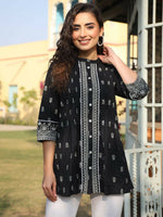 Juniper Women's Black Cambric Floral Printed TunicJuniper Women'S Black Cambric Floral Printed Tunic With Front Placket Three Fourth Sleeve Pintuck...