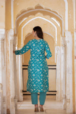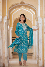 Varanga Women Blue Printed Round Neck Straight Kurta With Bottom And Dupatta