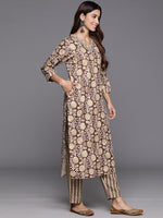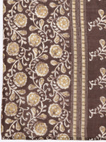 Brown Floral Foil Print Embroidered V- Neck Three Quarter Sleeves Side Slit Straight Kurta Paired With Tonal Printed Bottom And Dupatta