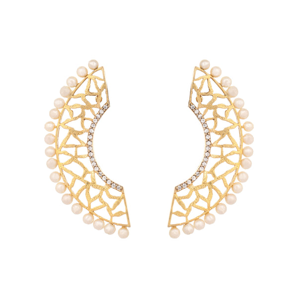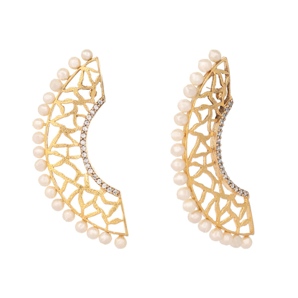 Nuyug 22K Gold-Plated Zircon Studded & Pearl Beaded Contemporary Shaped Statement Stud Earrings