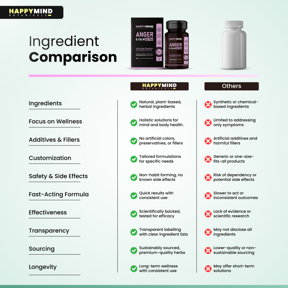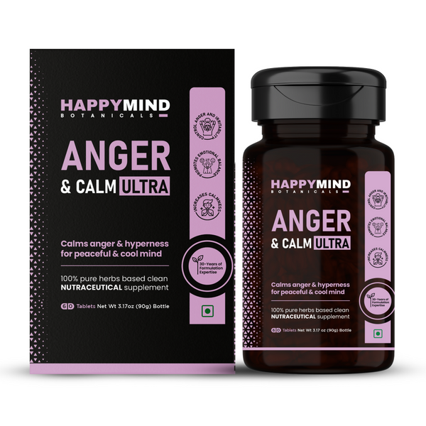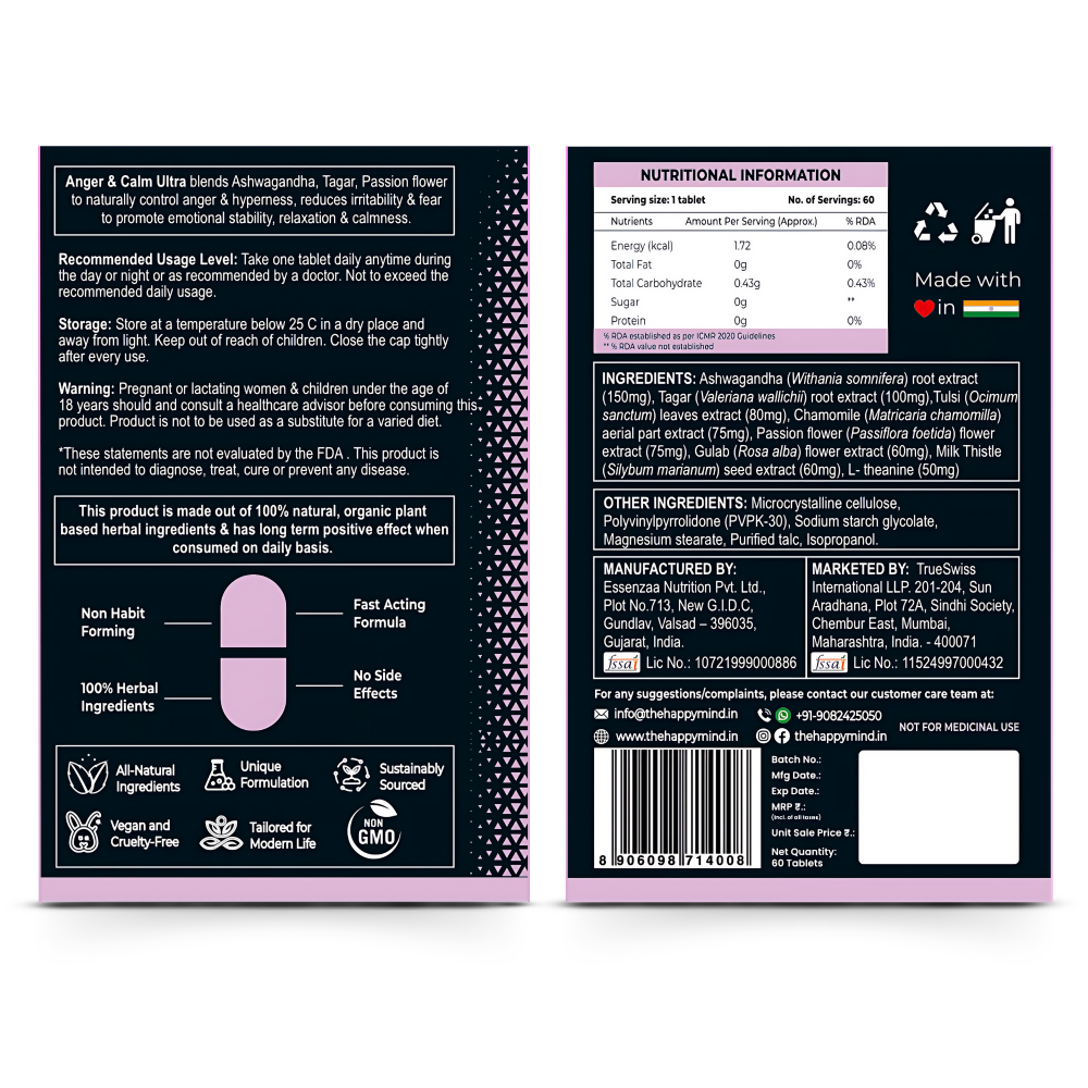 HappyMind Botanicals Anger & Calm Ultra Veg Tablets Ingredients: Ashwagandha, Tagar, Tulsi, Chamomile, Passion Flower, Gulab, and Milk ThistleD...