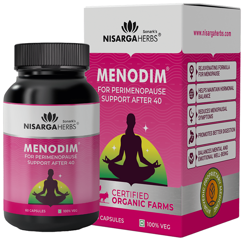 Nisarga Herbs Menodim Veggie CapsulesIngredients: Pomegranate Yashtimadhu Ashwagandha  Gokshuru Punarnava How to use:1 Capsule once or twice a day ...