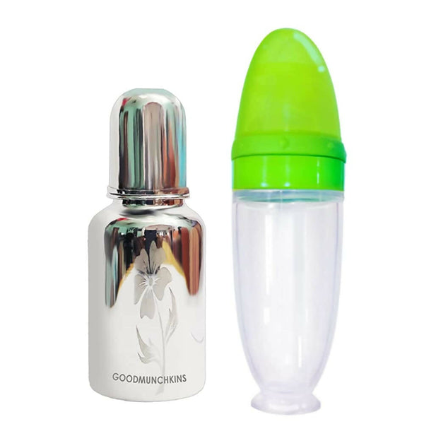Goodmunchkins Stainless Steel Feeding Bottle 304 Grade Jointless & Spoon Food Feeder for Baby Anti Colic Silicon Nipple Feeder 220 ml Combo Pac...