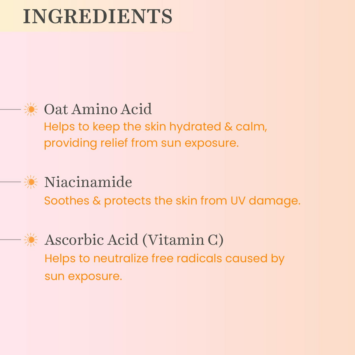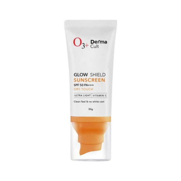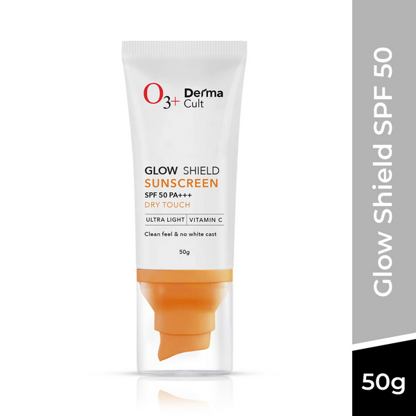 • Sunproof Your Glow With O3+ Derma Cult Glow Shield Sunscreen SPF 50 PA+++. With this daily sunscreen, you can have summer adventures without worrying about sun damage and tanned skin. Its lightweight formula offers powerful protection against 5 signs of sun damage while its dry touch finish ensures comfortable wear without any white cast. This gives extra protection from sun rays and ageing caused by heat. Oat amino acid soothes and moisturizes your skin, Niacinamide regulates oil production, minimizes pores, and boosts collagen, and Ascorbic acid, or vitamin C, fights off free radicals, brightens your complexion, and fades dark spots. This sunscreen is designed to keep your skin glowing and protected all season long. Dermatologically tested and suitable for all skin types, this sunscreen ensures you have a healthy and glowing summer complexion.