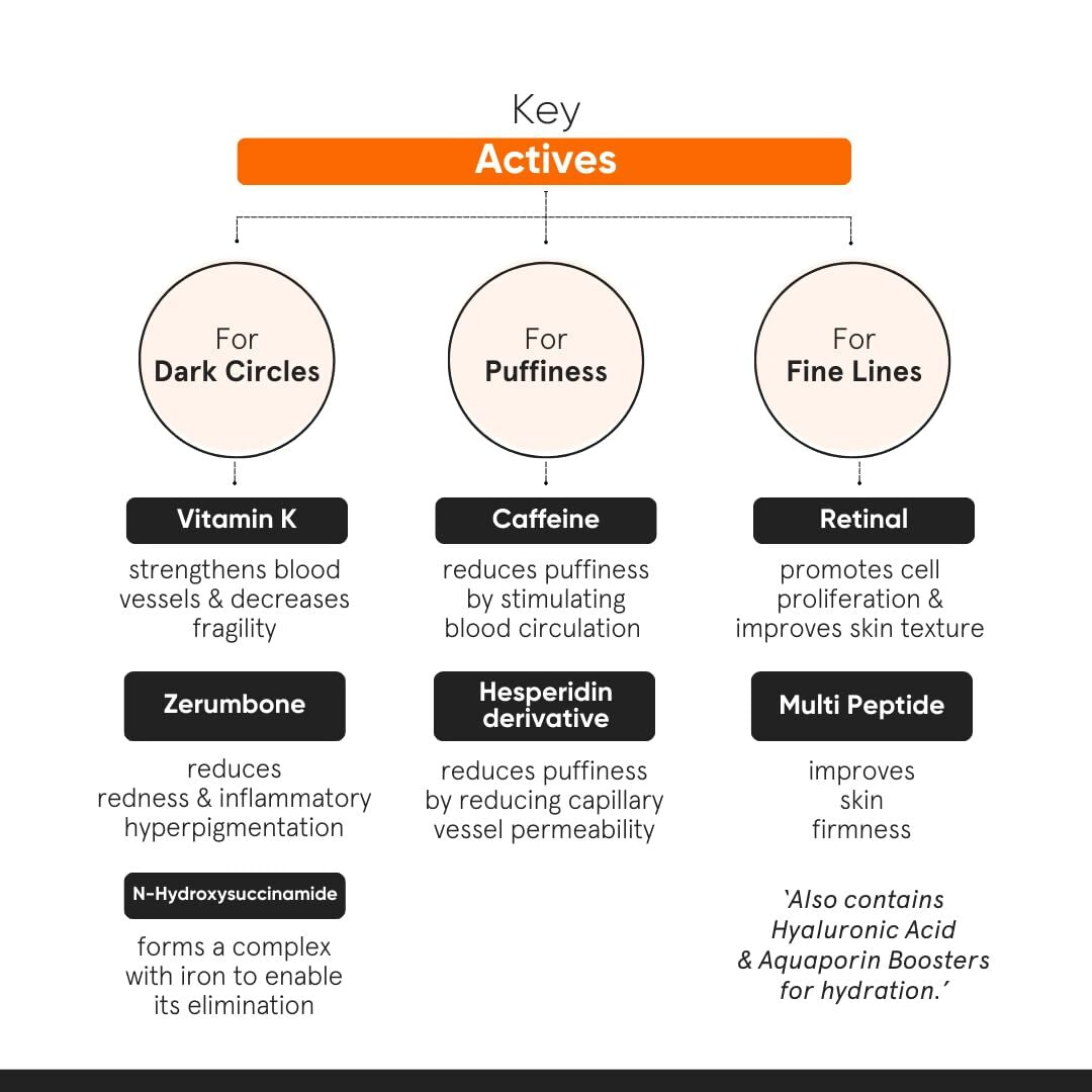 A lightweight under-eye cream swiftly combats dark circles, puffiness, and fine lines with a quick-absorbing, non-tacky formula. Vitamin K diminishes dark circles, Caffeine reduces puffiness, and Retina enhances skin texture. Synergistic Peptides tackle dark circles and puffiness, while Zerumbone addresses hyperpigmentation. Hyaluronic Acid and Aquaporin boosters ensure comprehensive hydration.