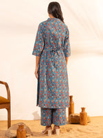 Janasya Blue Cotton Floral A-Line Kurta Set - M