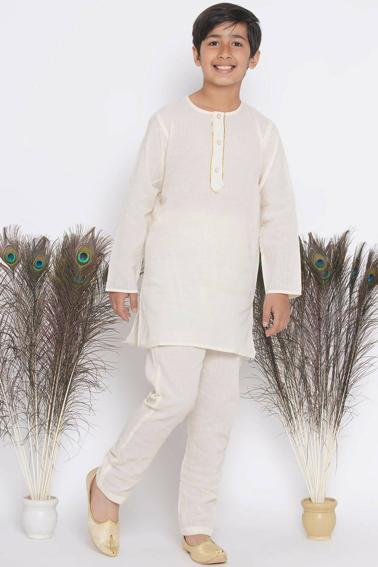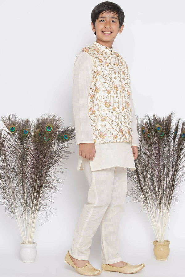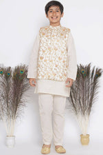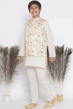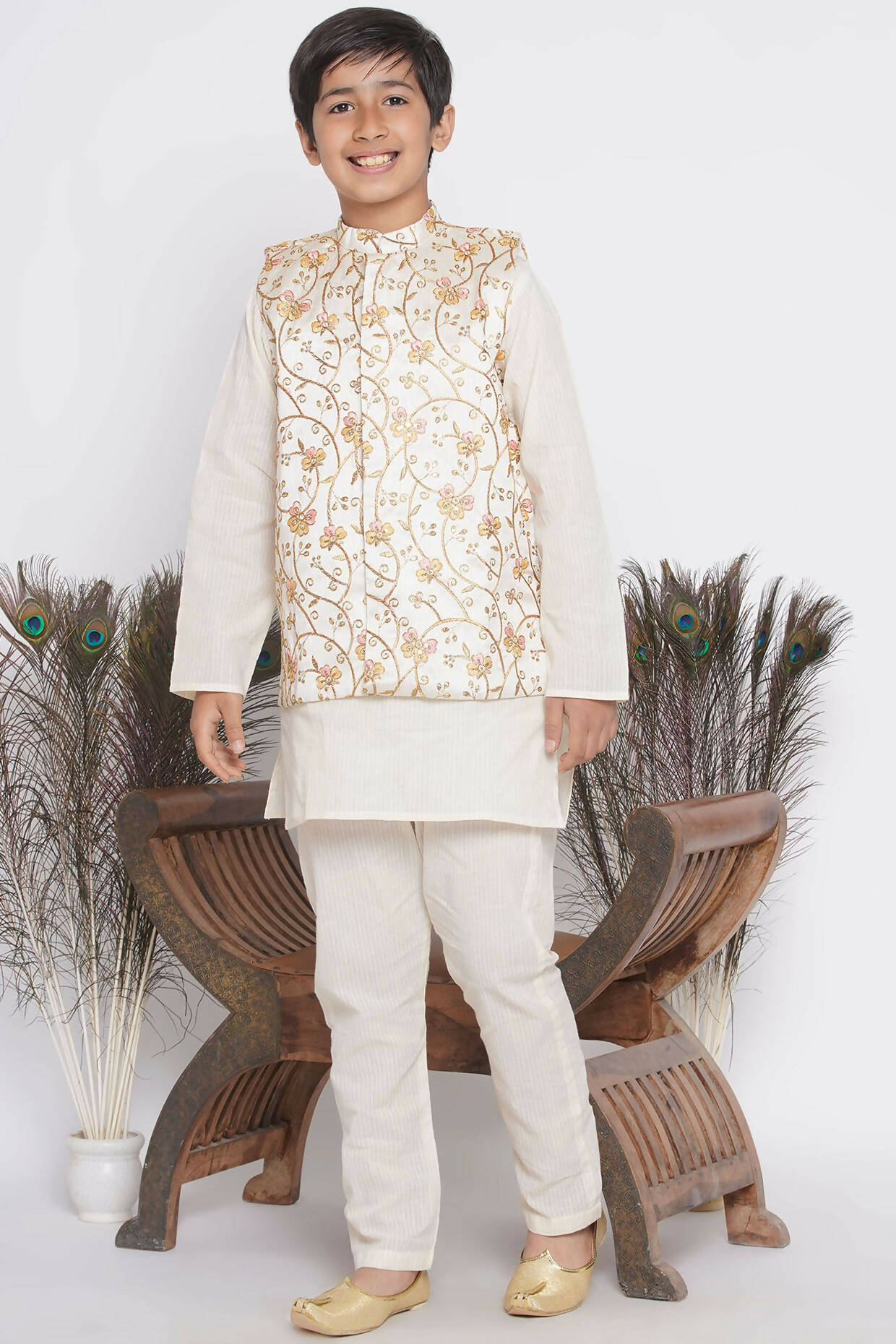 Little Bansi Banarsi Silk Orange Pink Floral Embroidery Jacket with Cotton Kantha kurta and Kantha Pyjama - Cream - 8-9 Y