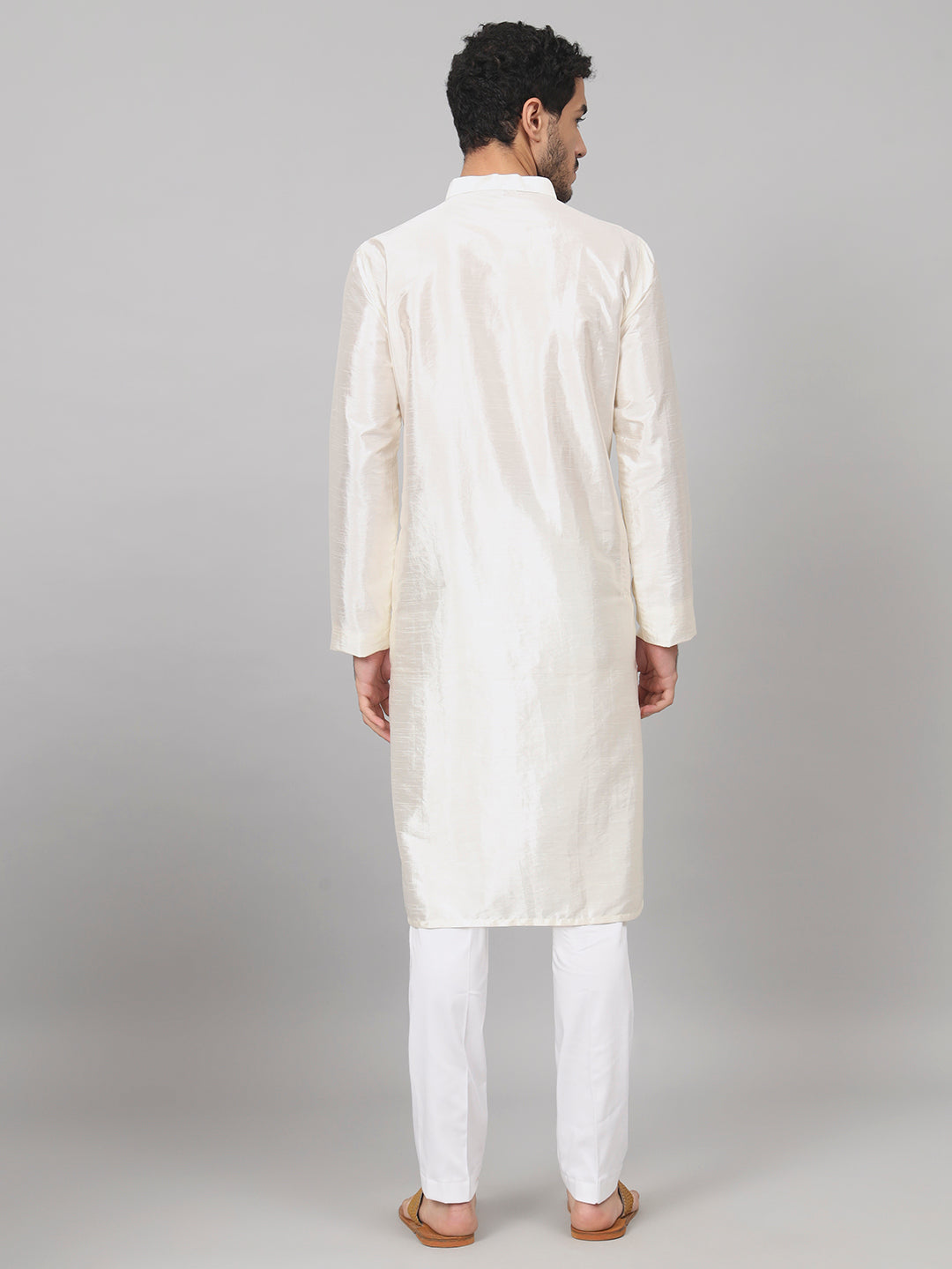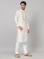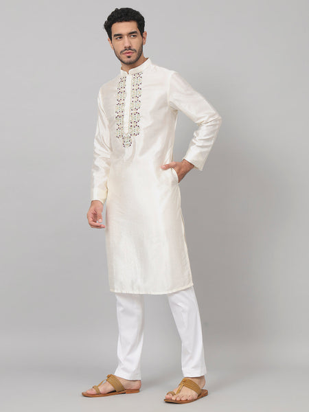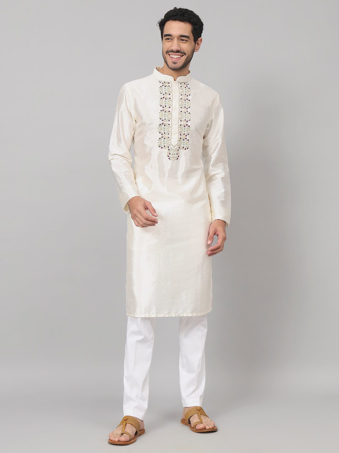 Rein Multicolor Embroidered Silk Kurta by Hilo DesignBehold our Off-White Kurta embellished with a Multicolor Embroidered Neckline, a testament to ...