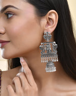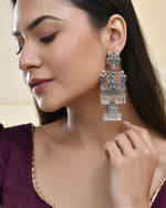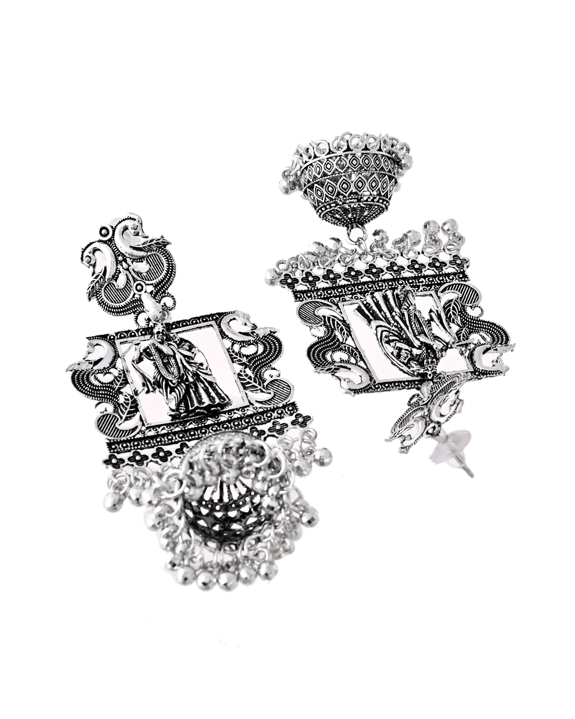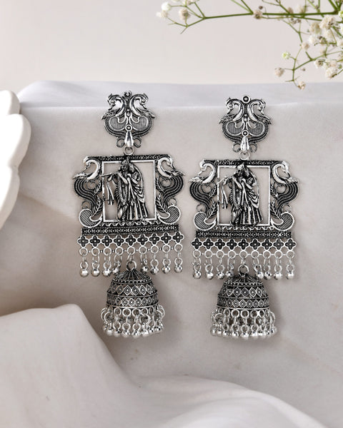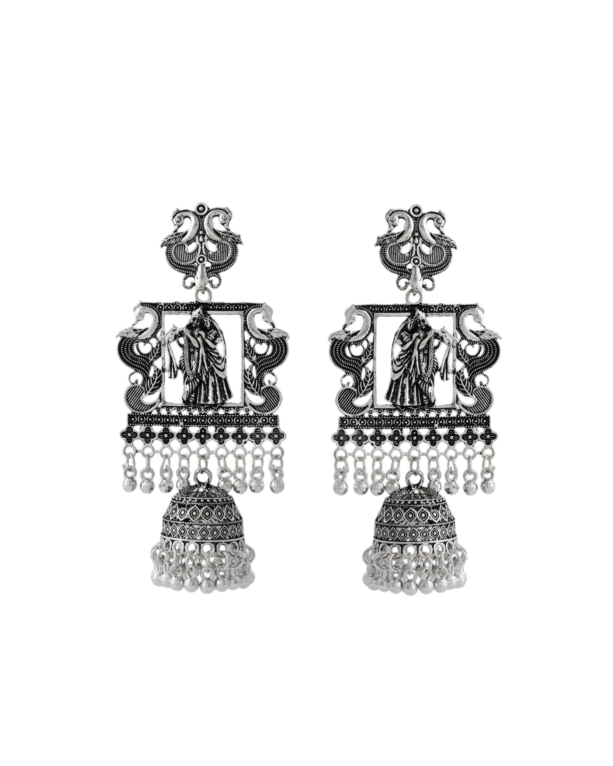 Make a bold statement with these intricately designed oxidized silver earrings featuring a detailed Krishna and Radha motif. The earrings showcase peacock and floral patterns, enhanced by finely crafted jhumka drops with delicate beadwork. The antique finish gives them a vintage charm, making them perfect for traditional and ethnic outfits. Ideal for festive occasions, weddings, and cultural events, these earrings are lightweight yet striking, combining spirituality with high-fashion design.