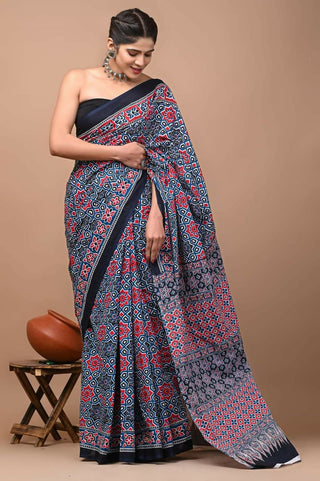Exclusive Collection Blue Red Beautiful Mulmul Cotton Saree