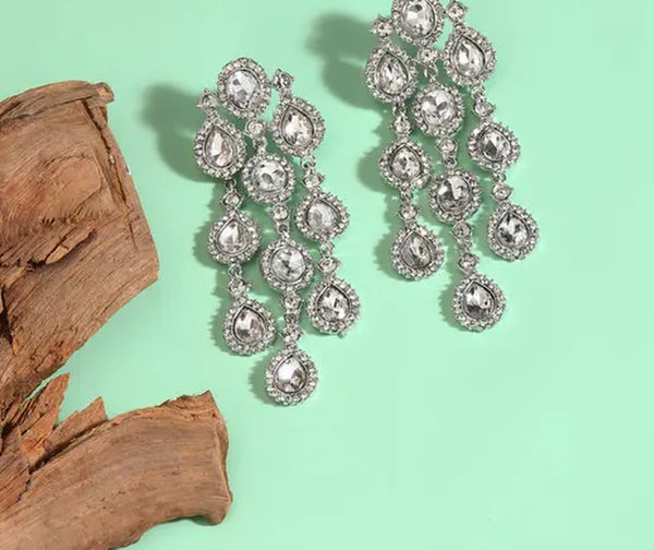 Make a regal statement with these stunning white cascade earrings, featuring an opulent arrangement of gemstones surrounded by sparkling crystals. These exquisite chandelier earrings showcase a magnificent waterfall design that captures light beautifully and adds movement to your ensemble.Each earring is meticulously crafted with: