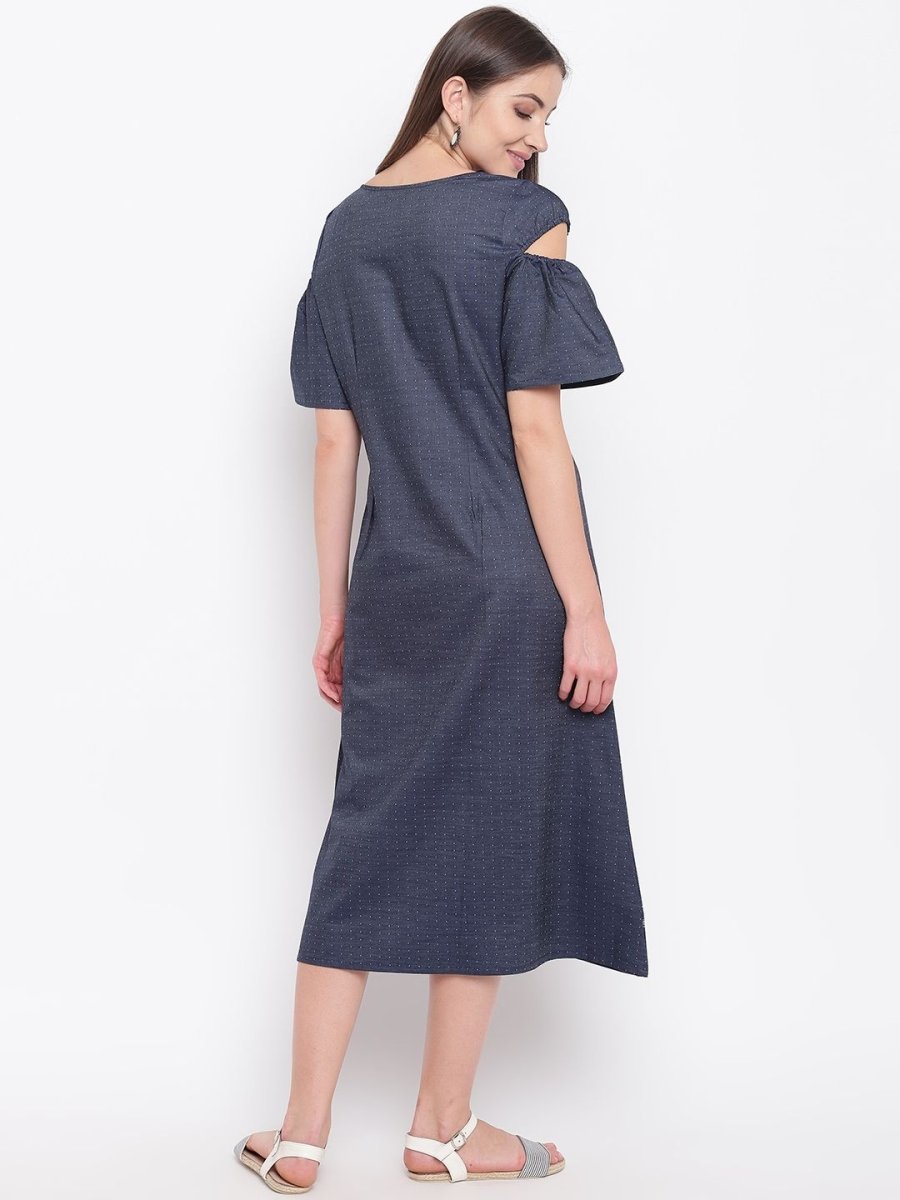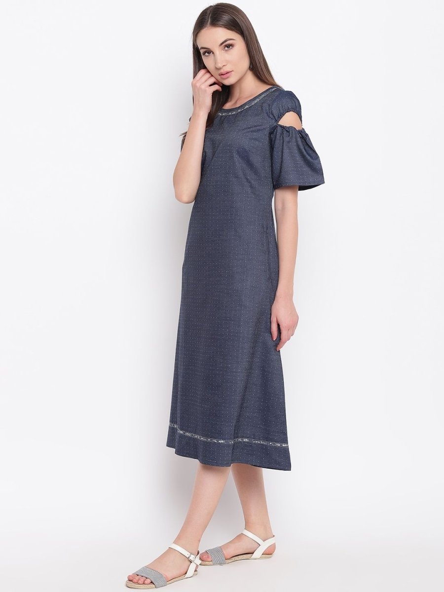 AURELIA Denim A-Line Cotton Dress Product Details Navy blue self-design wove denim A-line dress, has a round neck, short cold-shoulder sleeves, ...
