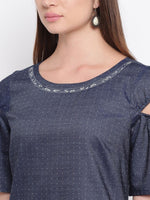 Navy blue self-design wove denim A-line dress, has a round neck, short cold-shoulder sleeves, straight hem