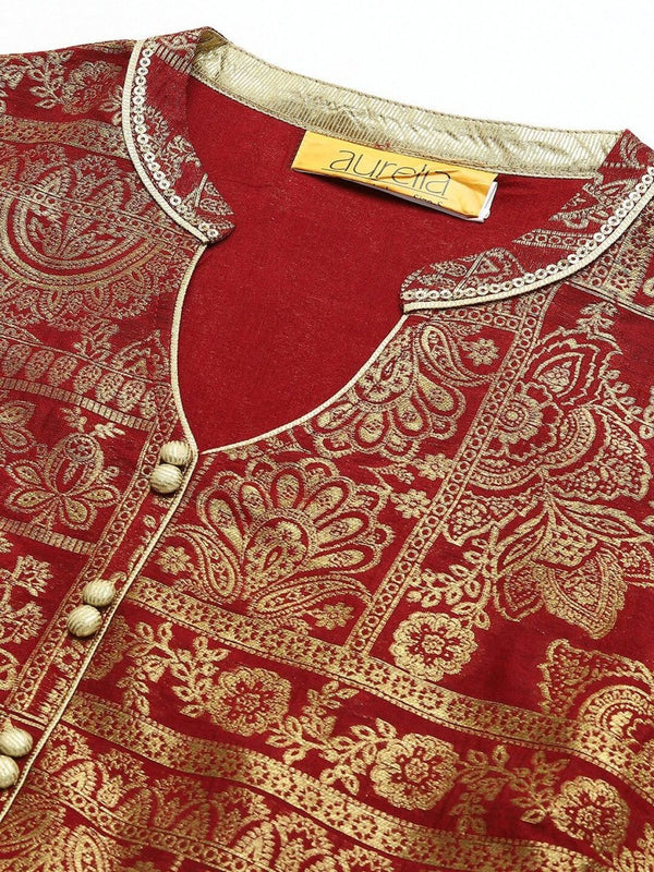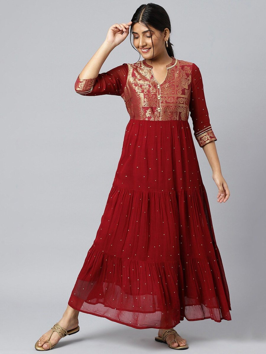 AURELIA Maroon & Gold Printed Ethnic Motifs Maxi Dress - Distacart