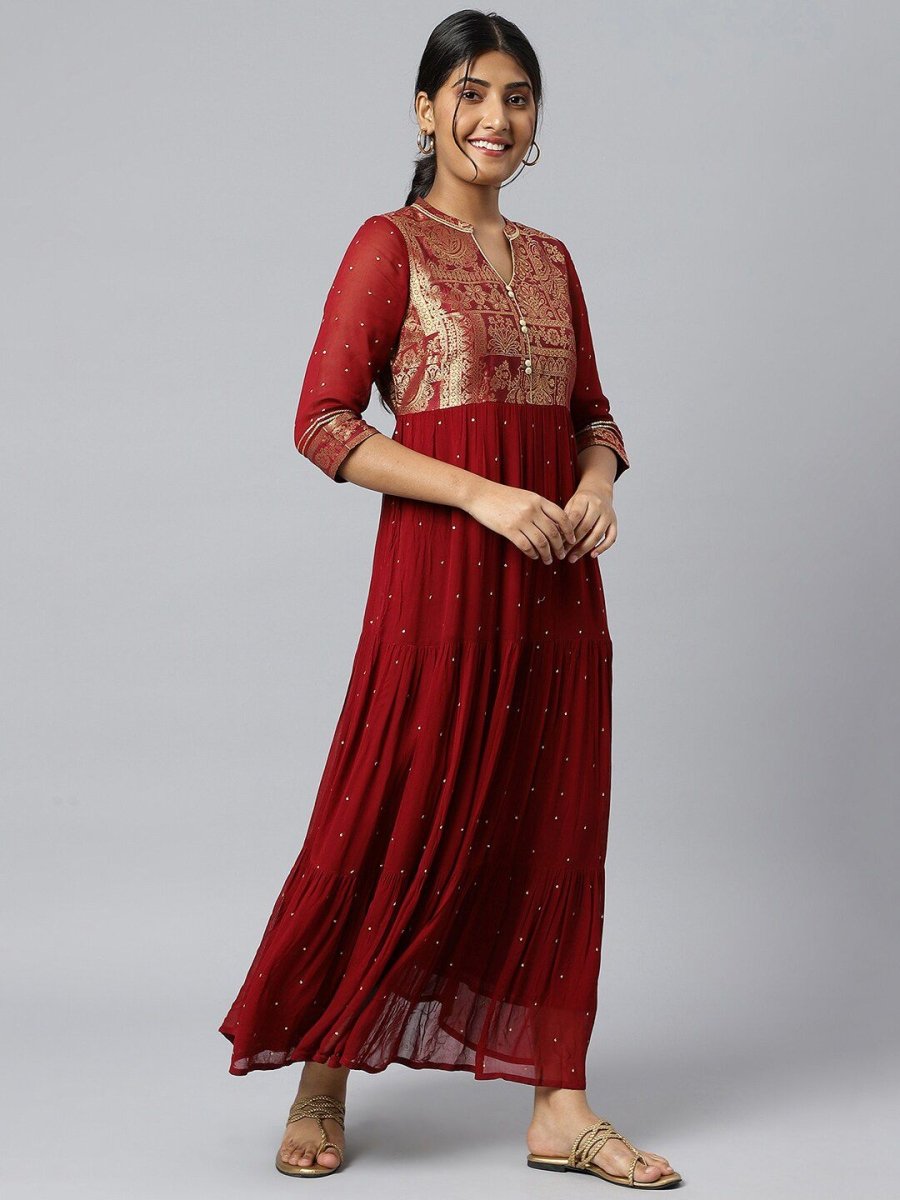 AURELIA Maroon & Gold Printed Ethnic Motifs Maxi Dress Product Details Maroon ethnic motifs print maxi dress Mandarin collar Three-quarter...