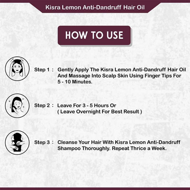 Kisra Lemon Anti-Dandruff Hair OilAbout the product: REDUCES DANDRUFF: Dandruff doesn’t stand a chance with Lemon! Leave no room for white flakes w...