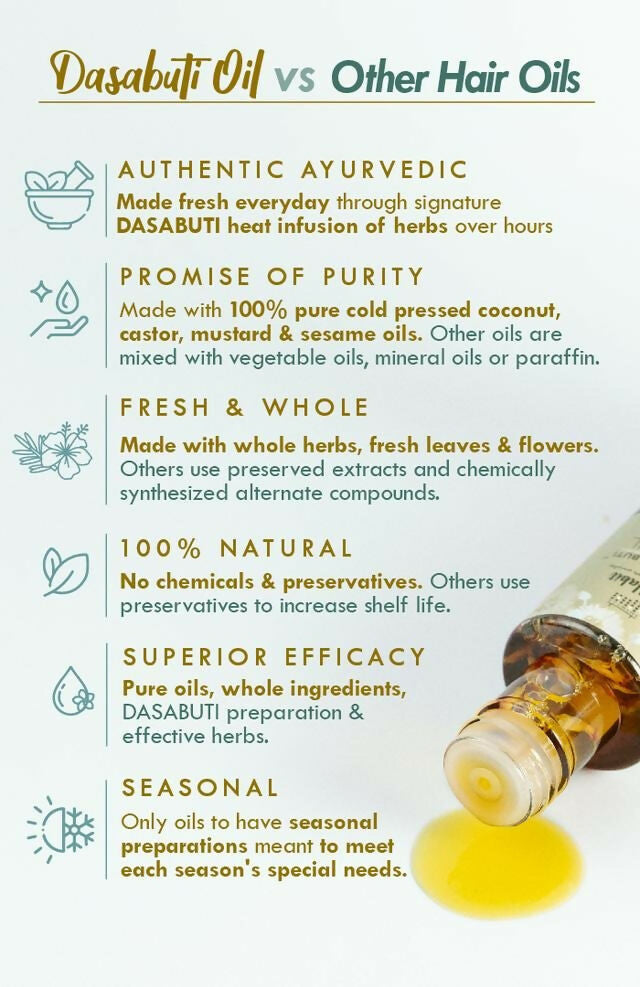 • Kitchen fresh Dasabuti Hair Oil enriched for over 10 HRS via slow heat infusion of herbs in multiple oils for maximised results.