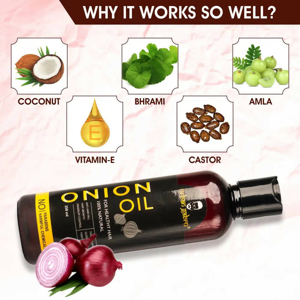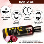 • Urbangabru Onion Oil is infused with rich hair growth components like sulfur and amino acids that provide strong, thick, and healthy hair when applied to the hair and scalp. It is a blend of Red Onion Oil, Argan Oil, Jojoba Oil, Coconut Oil, Bhringraj, Amla, Brahmi, Vitamin E, Castor Oil, Jojoba Oil, Hibiscus, Mango Butter, Shea Butter, Sandalwood Oil, and Rose Oil. It helps to promote hair growth and prevent hair fall, breakage, thinning scalp infections, dandruff, and such hair related issues. The ingredient, sulfur oil helps to promote collagen production, which is useful in the production of healthy hair growth cells. Regular application of this oil increases the blood circulation in your scalp to stimulate hair growth.