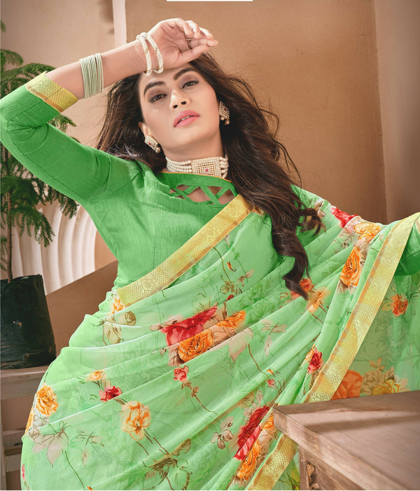 Green Georgette Floral Printed Saree With Unstitched Blouse Piece - Jyoti About the product: This sarees is made of Georgette fabric which is high...